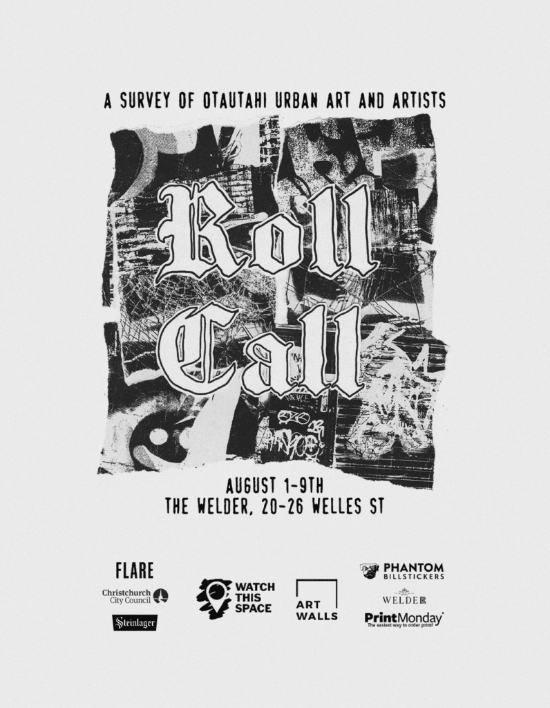 Roll Call – A Survey of Ōtautahi Urban Art and Artists – 10am -3pm daily (check Watch This Space socials for opening hour updates), August 1-9, The Welder Events Space, 22 Welles Street