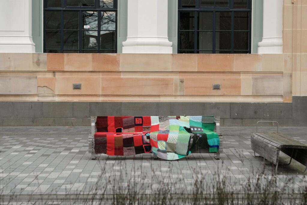 Kate Finnerty: Well, the material is soft and comforting, but there are also the colours involved, which are often so bright and vibrant. A friend said I came up with a new word talking about the ‘grayness’ of the city, and by putting these colourful, bright things out in the world, it makes you stop and think. People have been saying that they feel uplifted and joyful, even when it’s only been a day, and it’s like, wow, all this from creating something out of wool and putting it out there. And when people see it and think “I could do that”, I’m always keen to try to involve them in it, saying “Hey, you can be a street artist as well!”. This enables people of a different generation, and generally women, to actually be a street artist, to have a presence in the city and be noticed.