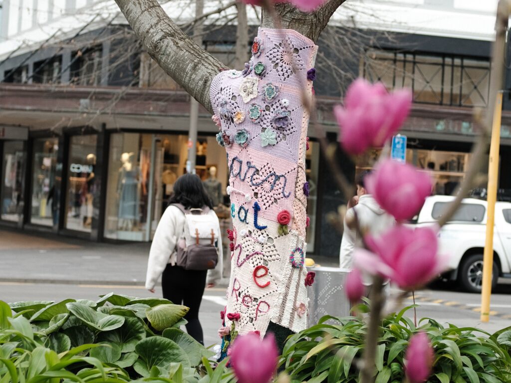 Kate Finnerty: I’m a crocheter to start with, but I’ve always loved yarn bombing because it seems so fun and playful. It’s just a real joyful expression. There was a lot of yarn bombing after the earthquakes, but once the city was being rebuilt there were less spaces where you could freely do stuff. So, I chatted to a few people and they seemed keen, so it kind of grew from there, really.