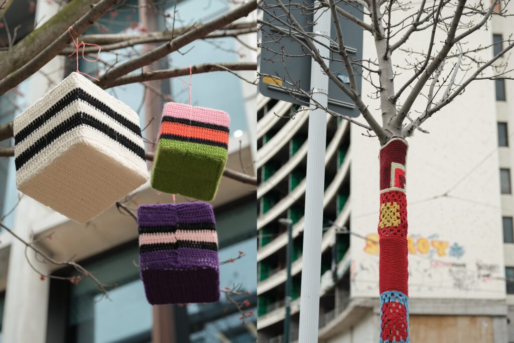 Kate Finnerty: There are a couple that kind of mirror what else is around as well. For example, while we were walking around the city one day, Deb, who helps me coordinate Yarnarchy, saw a little graffiti character. She said, “Oh, why don’t we try and yarn bomb it!”. There was a fence in front of it, so we’ve made a yarn bombed version of the character that’s behind it. Another one was a tree that had eyes painted on it, but you could only see them when you looked closely. They were super faded, I don’t know how long they’ve been there. So, we thought, why don’t we make some eyes that mimic those and just put them on? It just highlights what’s already there. They’re pretty cool.