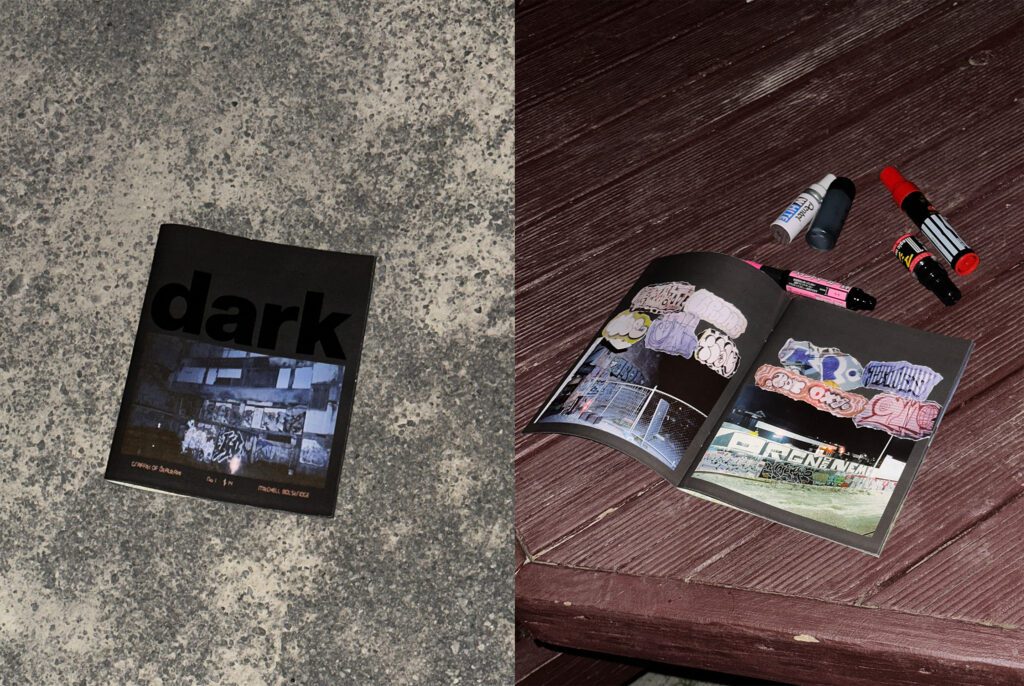 Zine history, obviously, is pretty wide-ranging, there are so many different approaches coming from the form’s independent streak. But there is a strong connection between graffiti and zine culture. Because graffiti is a rebellious pastime, documenting it has often fallen outside of the mainstream, and zines have been a really kind of popular form of documentation and sharing of the culture. Was that something that you were aware of when you started to make Dark?