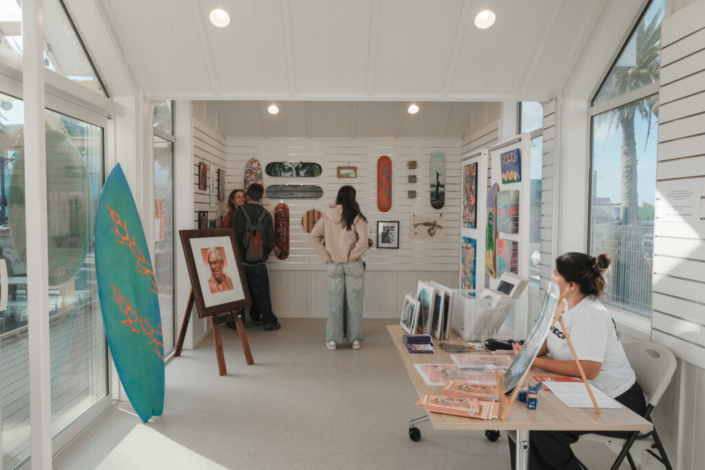 Stoked is open from 10am till 4 from Friday through to Sunday at the Village Green. If people want to buy a Carve board, they can either email us ([email protected]) or come to the Village Green hut and someone will be here who can take payment. All the boards are $500, which is pretty amazing considering some of the artists there. And, of course, all profit goes to surf safety lessons for east side youth!