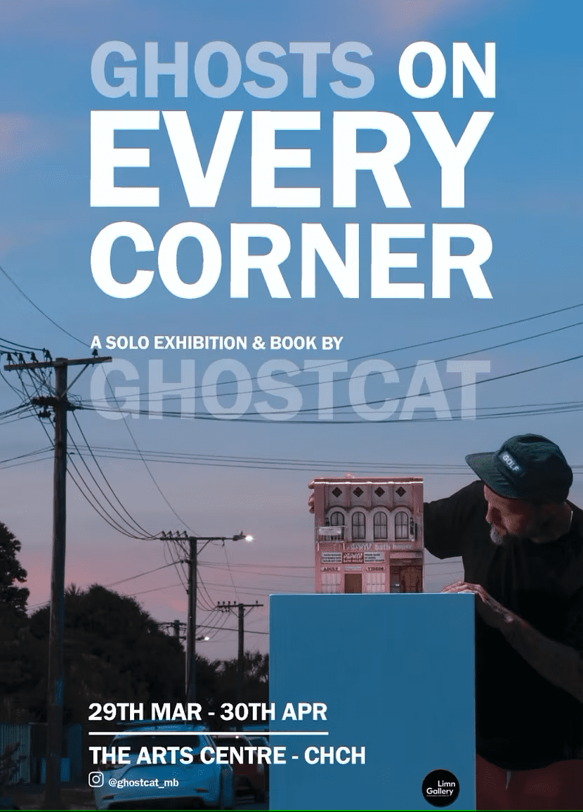 I might be a bit biased (Disclaimer: I was the author of the Ghosts on Every Corner book and have been involved in the project since it’s initial genesis), but it is hard to go past Ghosts on Every Corner as one of the most impactful art projects to emerge from Ōtautahi in 2025. Numbers generally don’t lie – tentative counts suggests more than 10,000 people visited the Pūmanawa Gallery space at the Arts Centre in the five week run that Ghostcat’s scratch-built recreations were on display, a huge figure for an independent project. Additionally, the book documenting and expanding the project, featuring striking photography by the super talented Dave Richards, has proven popular, selling more than 700 copies on pre-order before being placed on the bookshelves of retail outlets. It would be fair to say that Ghosts on Every Corner struck a chord.